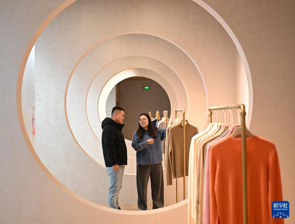 2025年1月18日,河北省邢台市清河县一家羊绒制品生产企业的员工在展厅内为客户介绍产品。新华社记者牟宇摄