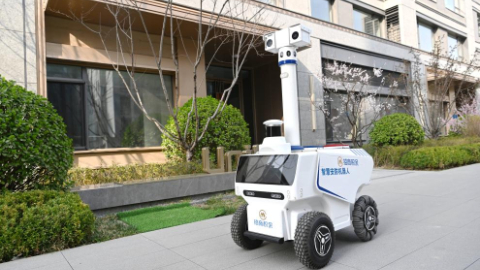 智慧安防机器人在雄安新区华清园小区巡查(3月25日摄)。该机器人具备全天候自动巡逻、环境监测、人体检测、车牌识别、烟火识别等功能,能够完成部分夜间值守、重点区域巡查等工作,提升社区安全感和治理效率。