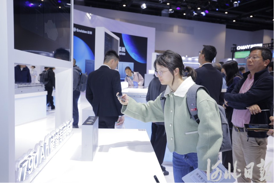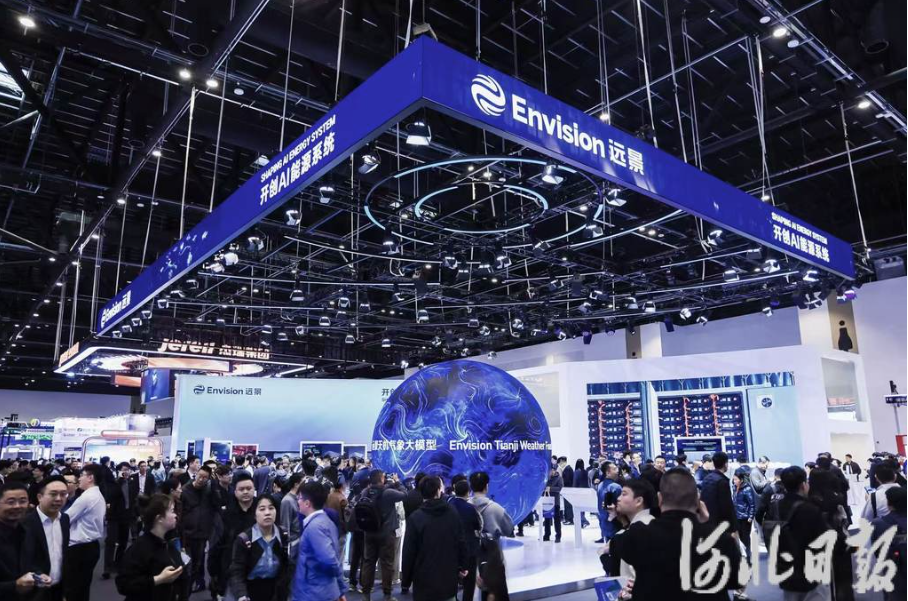 4月1日,在北京举行的第十四届储能国际峰会暨展览会上,与会人员参观远景科技集团展区。胡逸飞摄