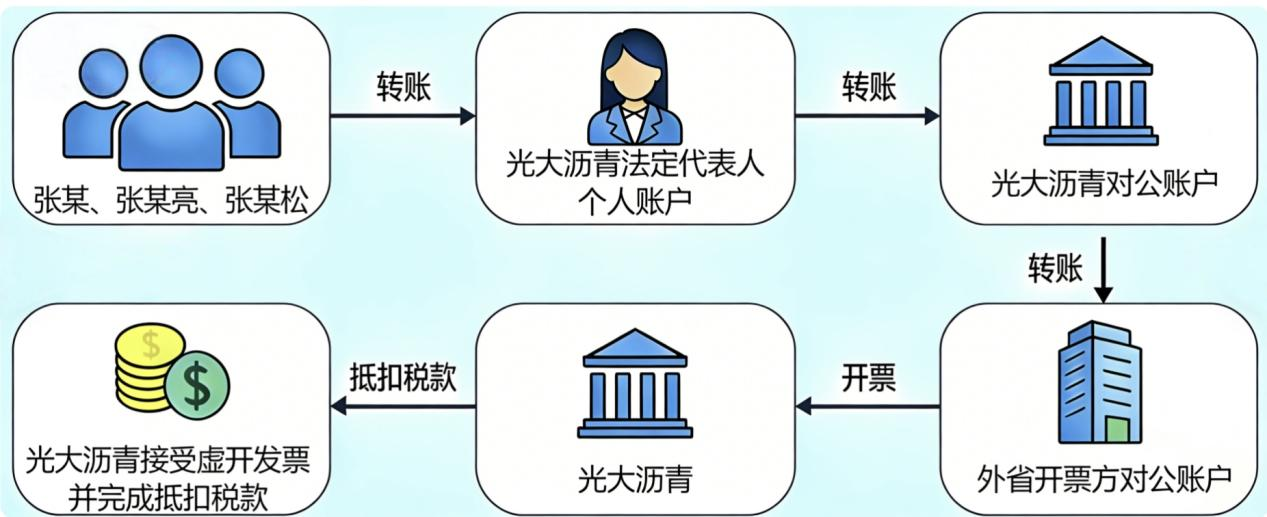 为解开巨大差额疑云,检查人员依法向金融机构调取了光大沥青及涉案人员的资金往来记录。经资金追溯,光大沥青向外省开票方支付的2495.19万元款项并非其公司自有,而是由“张某、张某亮、张某松”将全部资金转至光大沥青法定代表人邢留飞后,由邢留飞再将资金转入光大沥青对公账户,最后以光大沥青的名义转至外省开票方。