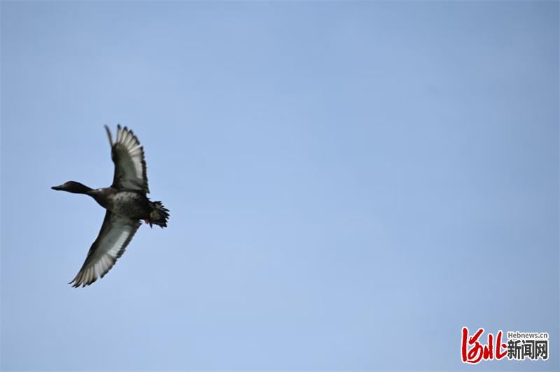 4月2日上午,全球首次青头潜鸭野化放飞活动在衡水湖举行。图为放飞后的一只青头潜鸭,在衡水湖上空飞翔。河北日报记者焦磊 摄