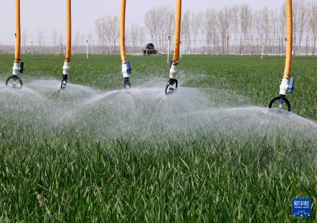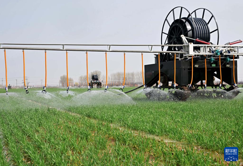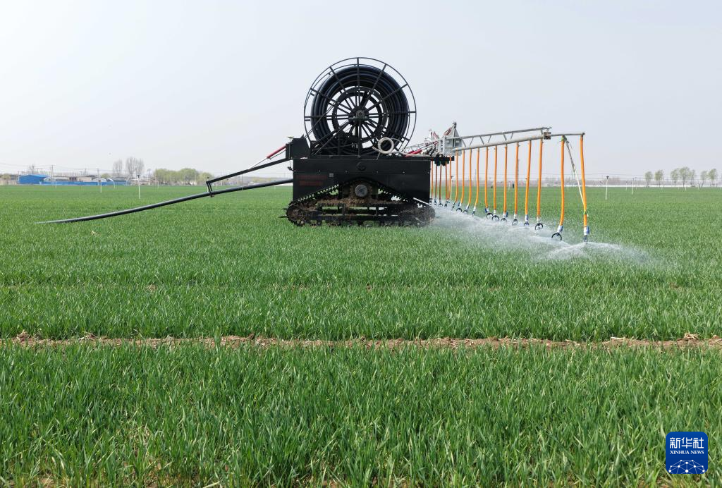 4月2日,自走式水肥一体农田喷灌设备在河北省唐山市丰南区大新庄镇的冬小麦田间进行喷灌作业。