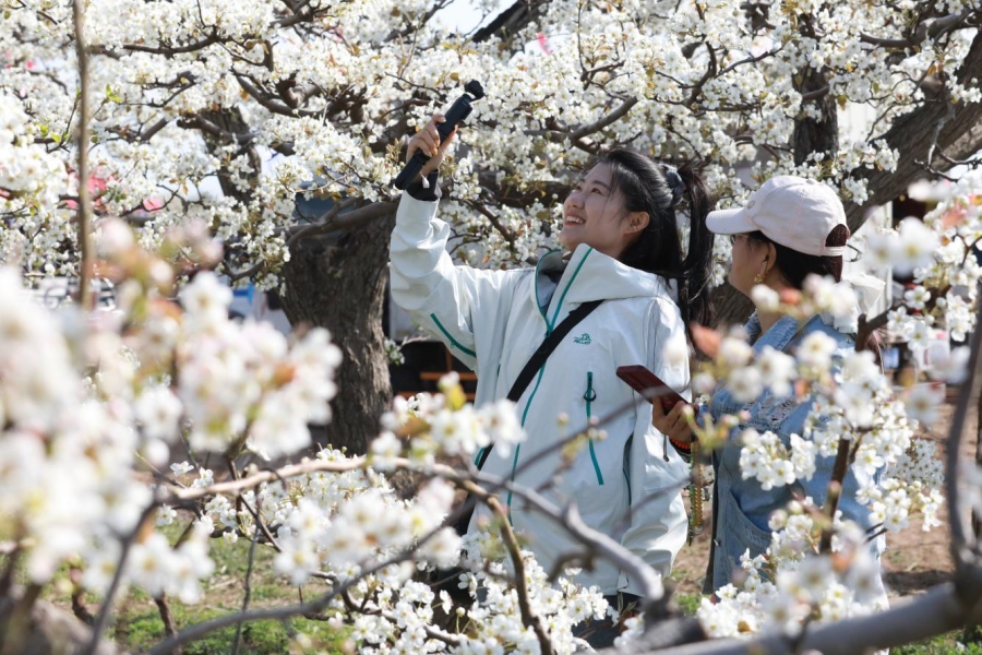 近日,在河北省沧州市沧县,桃花、梨花次第绽放,吸引众多游客前来踏青赏花、拍照打卡。当地立足生态资源优势,以花为媒,打造多元融合场景,激发了春日消费活力。