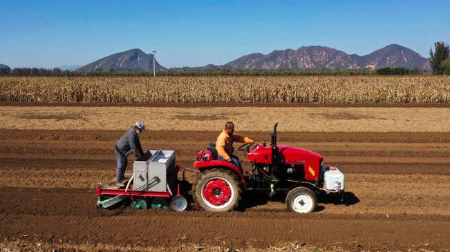 近日,河北唐山遵化市农民利用晴好天气抢种冬小麦,确保完成今年近10万亩冬小麦播种任务,为明年夏粮丰收打下基础。