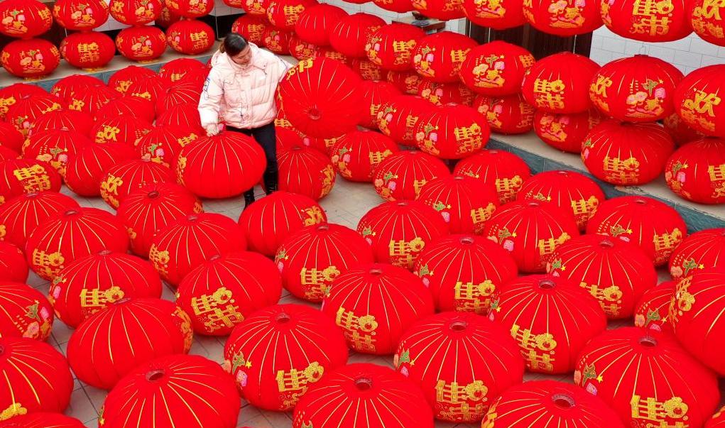 新年临近,河北省邢台市南和区东三召乡的灯笼作坊赶制各式灯笼,供应市场。近年来,东三召乡依托当地传统灯笼制作技艺,结合市场需求,生产植绒灯笼、拉丝灯笼、传统宫灯等灯笼产品,吸纳村民在家门口就业增收。