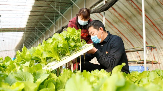 1月15日,邢台市南和区和阳镇东侯庄村党员与农户在了解水培蔬菜生长情况。