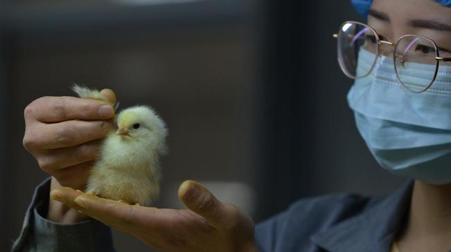 3月29日,在石家庄市栾城区一家农业科技公司,技术人员在自动生产线上分拣鸡苗。