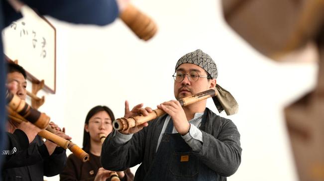4月5日,在石家庄市新华区尺八古乐器工作室,曹昊指导学员吹奏乐曲。