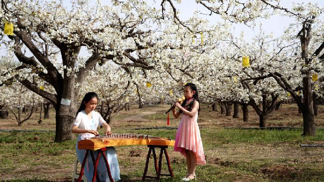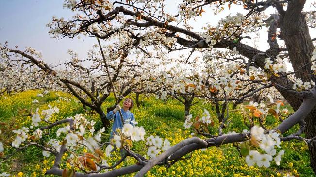 4月12日,河北省石家庄市深泽县大桥头镇农民为梨花授粉(无人机照片)。