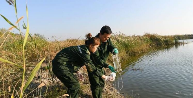 图为河北省地矿局水勘院工作人员正在取水做水质调查研究。