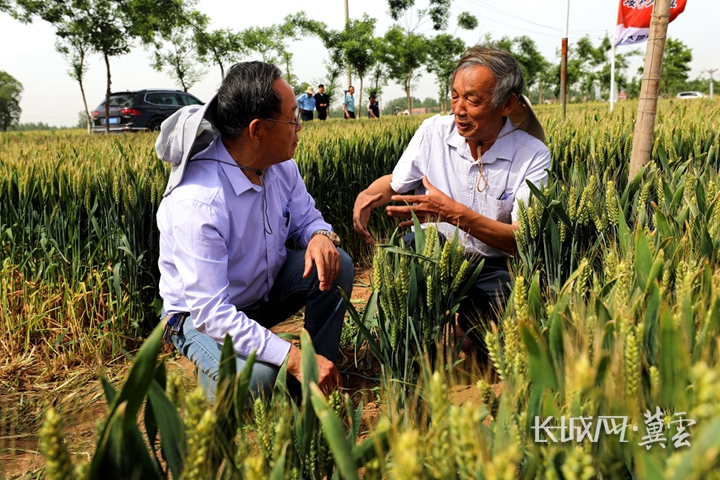 郭进考(右一)与石家庄市农林科学院研究员赵文庆(左一)在田间查看小麦长势。
