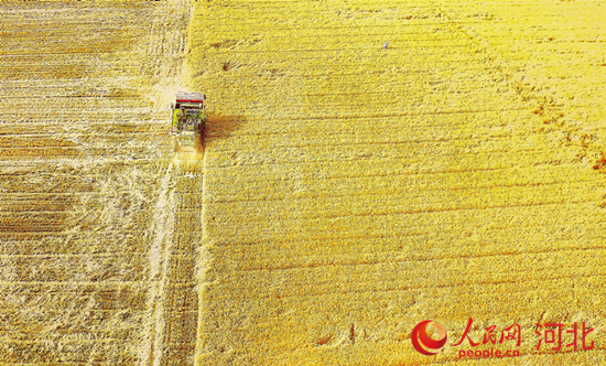 2021年6月5日,邯郸市临漳县兵马寨农业示范田基地内,小麦收割机正在进行夏收作业。冯静摄