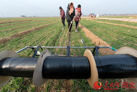 2021年12月22日,邯郸市肥乡区明霞家庭农场工作人员使用自制设备铺装迷宫式滴灌带。 薛建东摄
