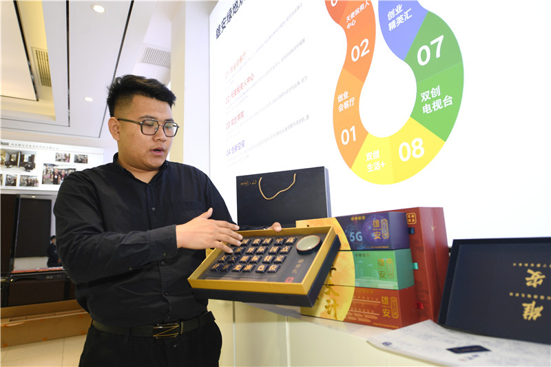 杨硕正在展示团队创作的雄安主题文创产品。新华社记者 朱旭东 摄
