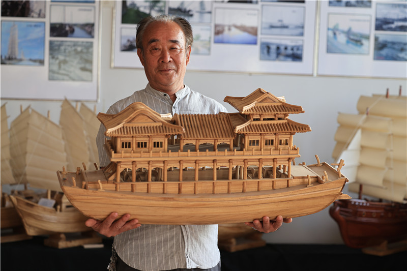 刘广玉展示精美的木船模型。新华社记者 邢广利 摄