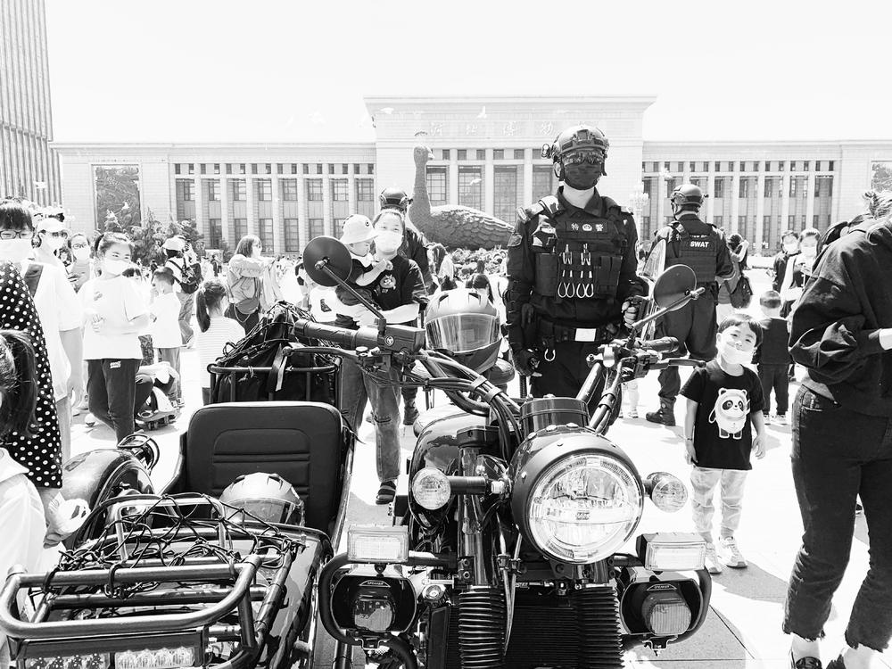 5月1日,唐林和队友来到河北博物院附近巡逻。三辆警用边三轮摩托车,六名特警队员,刚一亮相就引来市民围观,很多小朋友争相前来合影。