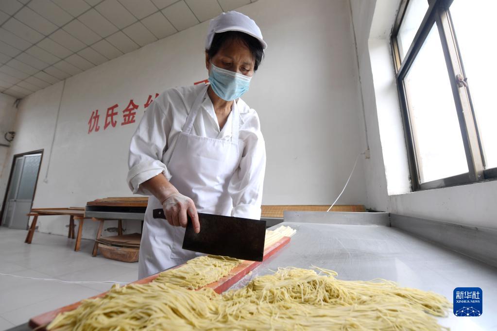 8月30日,饶阳县一家金丝杂面公司的工人在车间内切面。