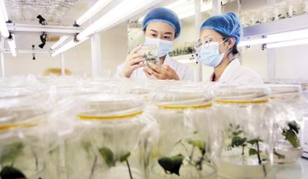 磁县禾下土脱毒红薯种苗基地技术人员在培养室里观察脱毒红薯种苗生长情况。河北日报通讯员 赵飞飞摄