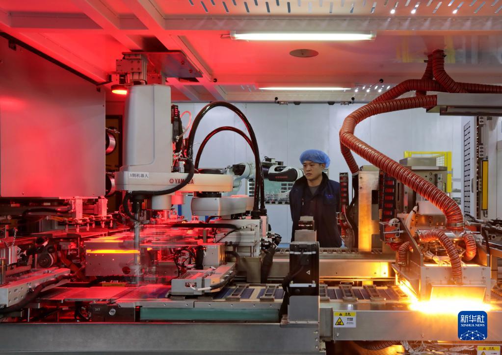 2月22日,保定国家高新技术产业开发区一家太阳能发电板制造企业工人在生产线上工作。