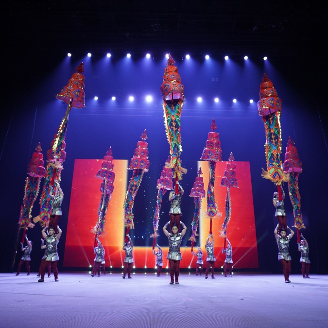 惊险奇美的杂技技巧,巧妙融入京剧元素、古典舞与武术的动作特点,塑造了内蕴中国优秀传统文化基因的视觉形象,展示了勇士们的坚毅刚强和忠心报国精神。