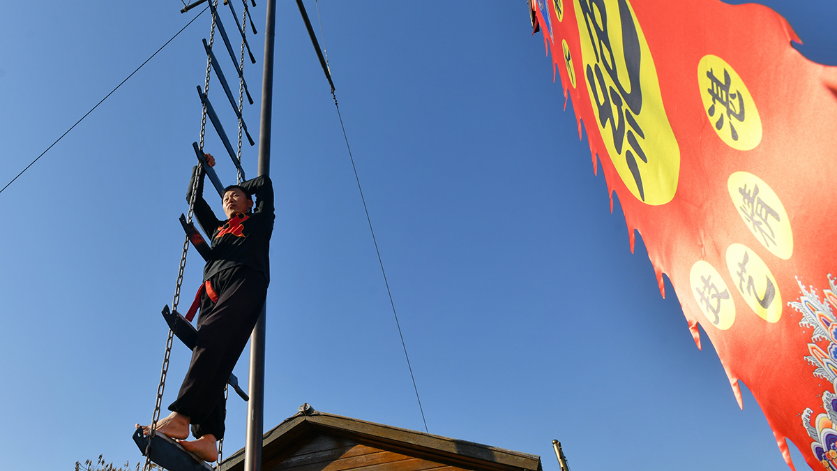 杂技艺人表演《上刀山》