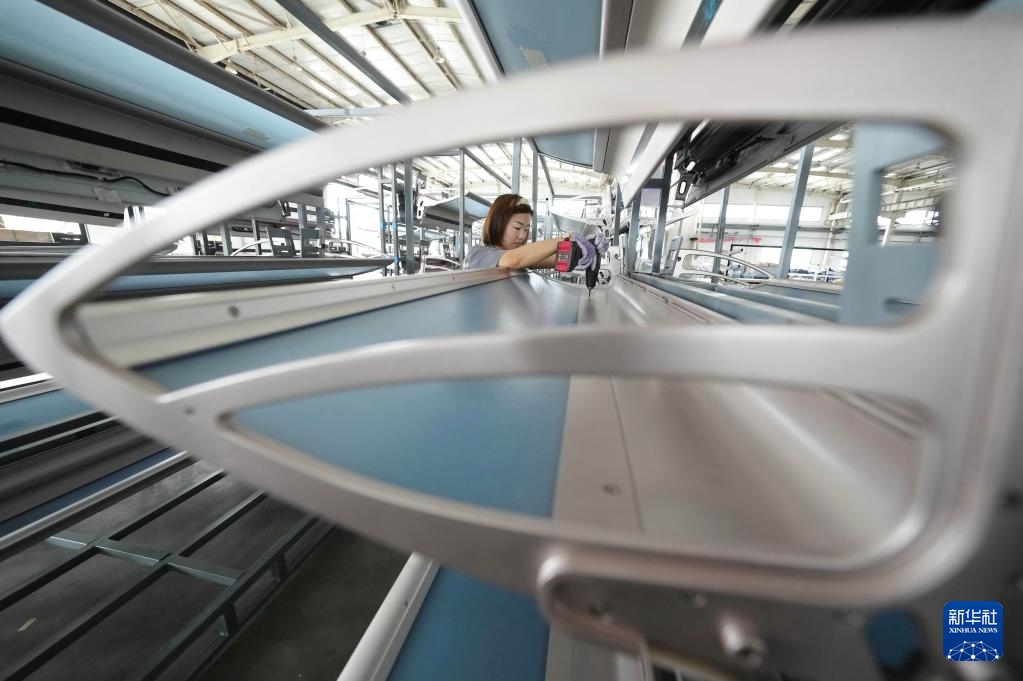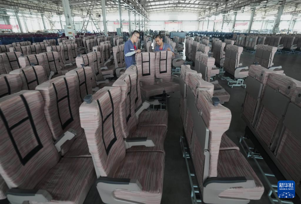 7月1日,工人在河北省唐山市丰润区一家动车组列车配件企业的生产车间检查动车组列车座椅的质量。