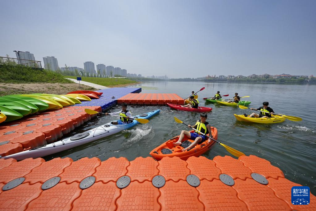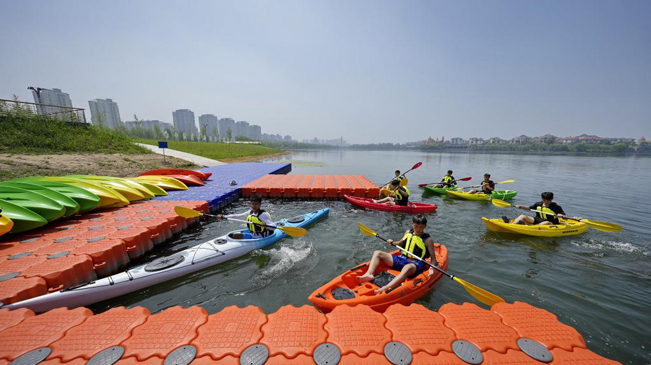 7月7日,学生在河北省迁安市滦河左岸体育公园练习皮划艇。