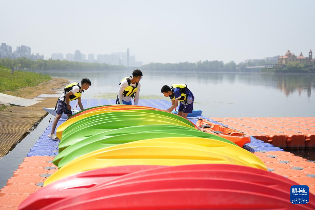 7月7日,学生在河北省迁安市滦河左岸体育公园内整理皮划艇。