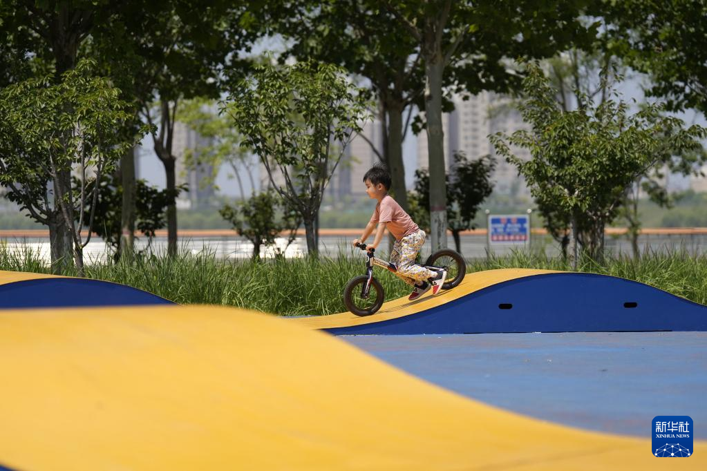 7月7日,小朋友在河北省迁安市滦河沿岸一个亲子游乐场游玩。