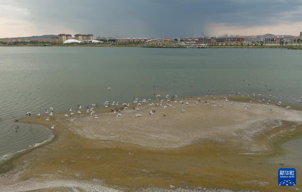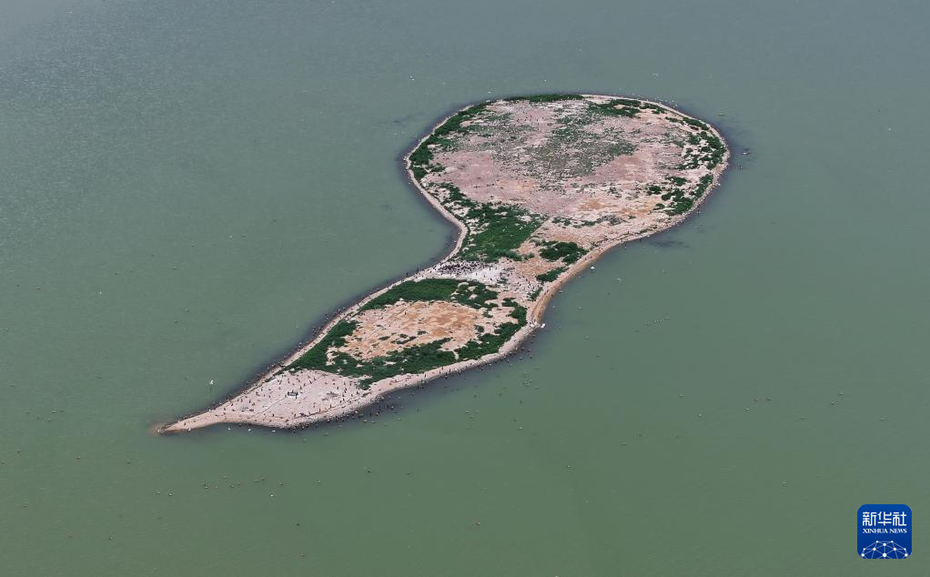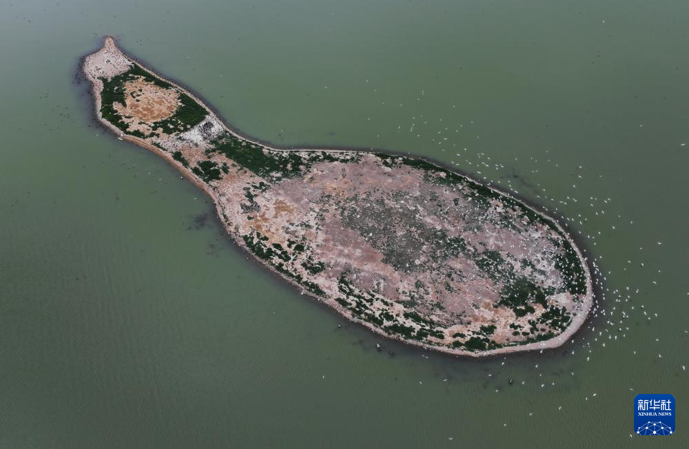 7月11日,大批候鸟在康巴诺尔国家湿地公园湖心岛觅食(无人机照片)。
