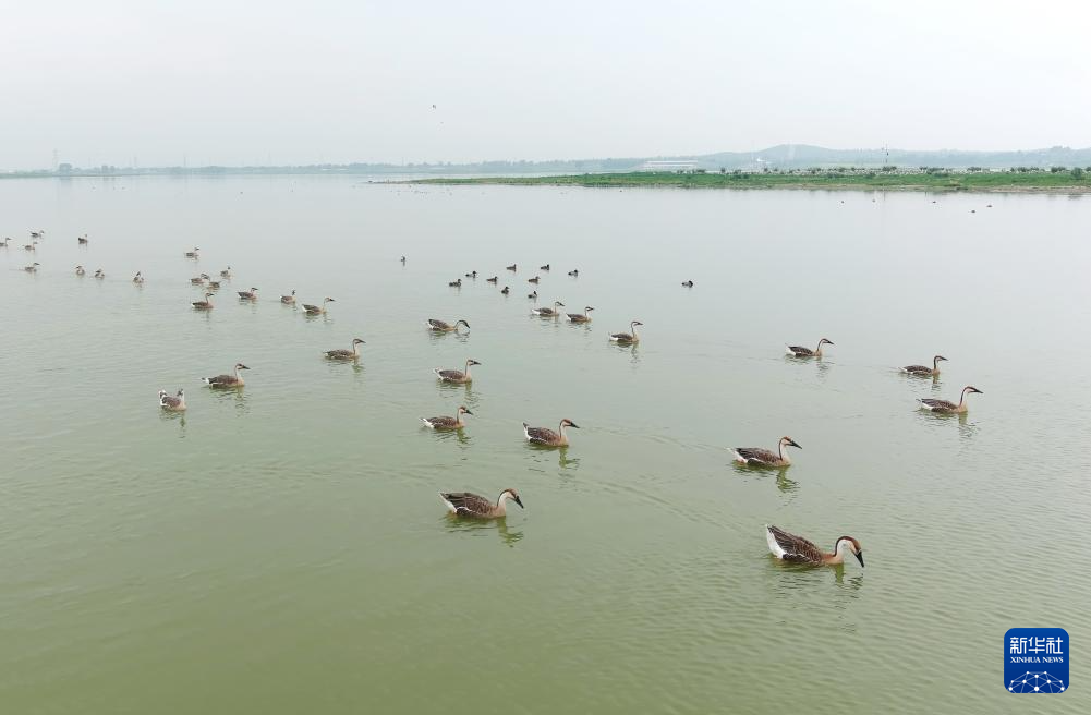 7月12日,一群鸿雁在康巴诺尔国家湿地公园湖面上游弋(无人机照片)。
