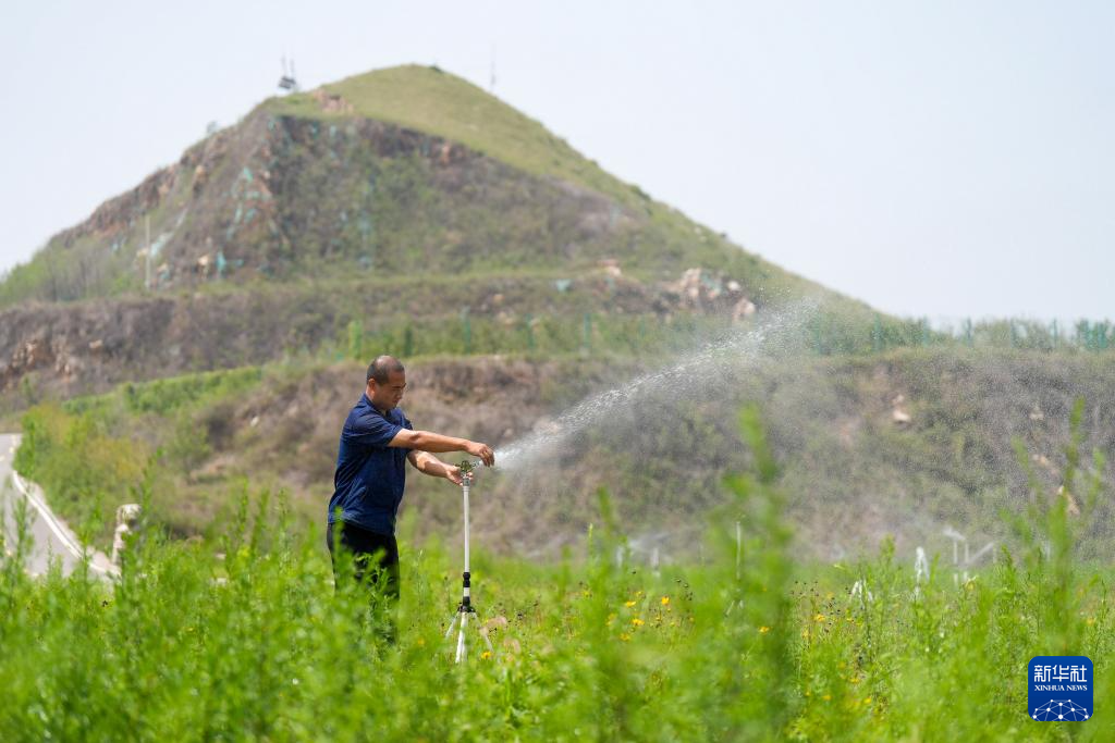 7月14日,工人在河北省唐山市古冶区一处矿山修复区内检修喷灌设施。