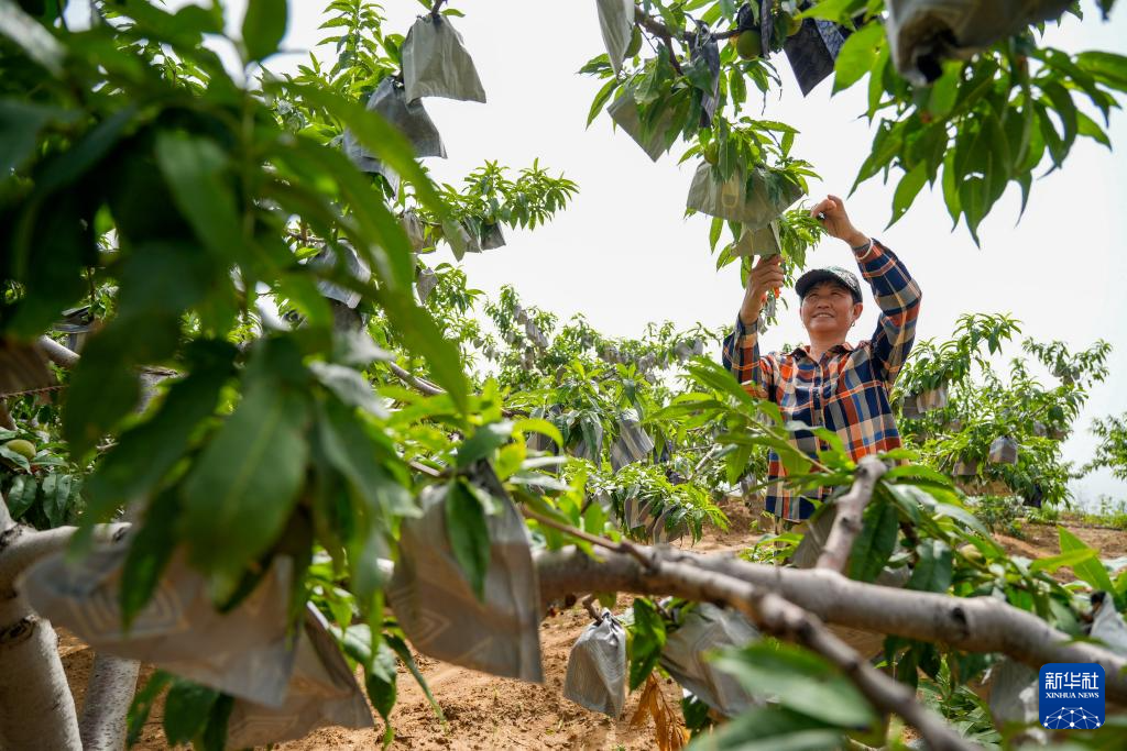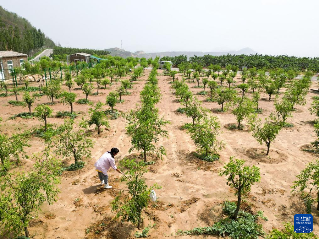 7月14日,工人在河北省唐山市古冶区一处修复矿山后建成的果园内打理果树。