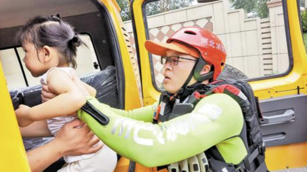 “谢谢你们这些可爱的消防员,把我们一家四口从灾区转移出去。”码头镇天保馨悦湾小区居民田景涛拉住石家庄市消防救援支队作战训练处处长王龙鑫的手,激动地说。