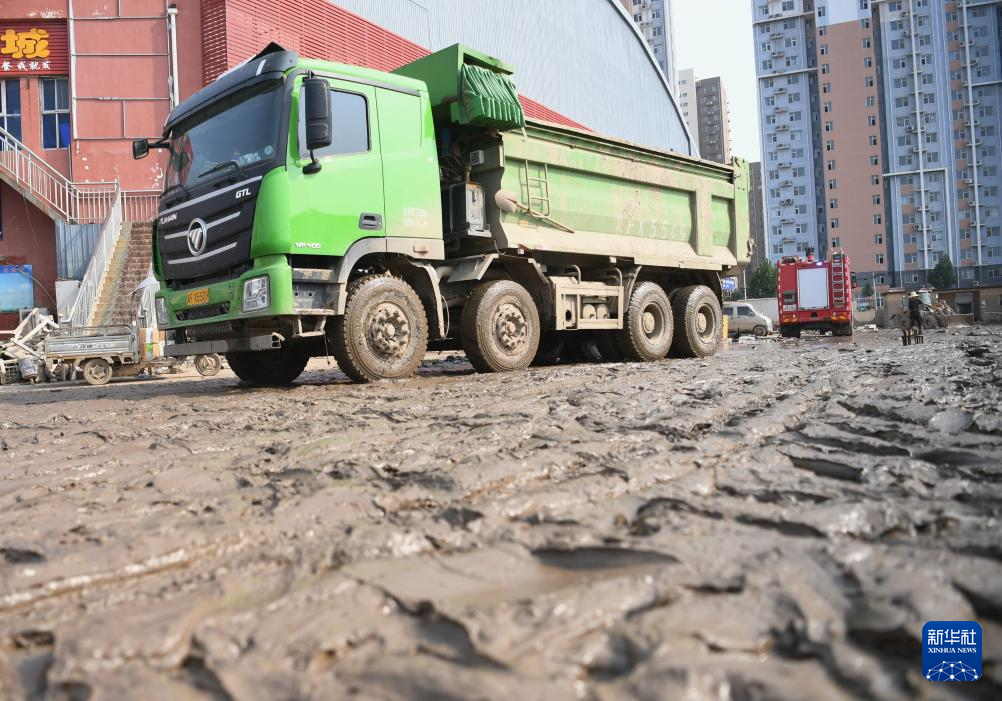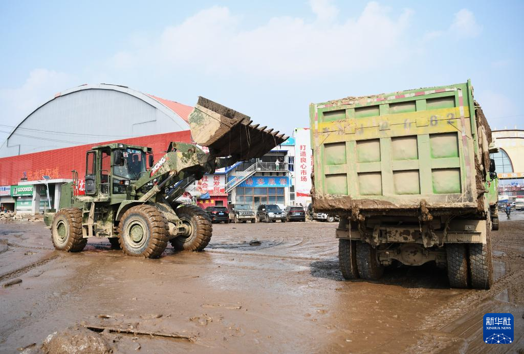 8月9日,车辆在涿州新发地大石桥农副产品批发市场清理淤泥。