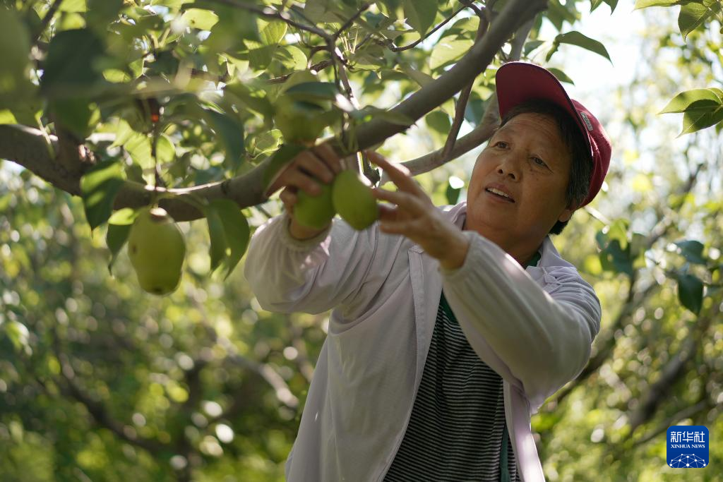 8月22日,在吴桥县于集镇北史庄村,村民在采摘红酥梨。