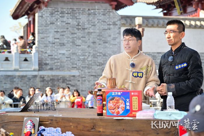 东方小孙(右)、主播明明(左)介绍火锅鸡。长城网·冀云客户端记者 许付磊 摄
