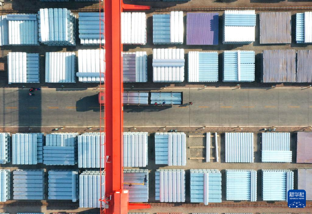 12月5日,成安县一家制管企业的工作人员将产品装车外运(无人机照片)。
