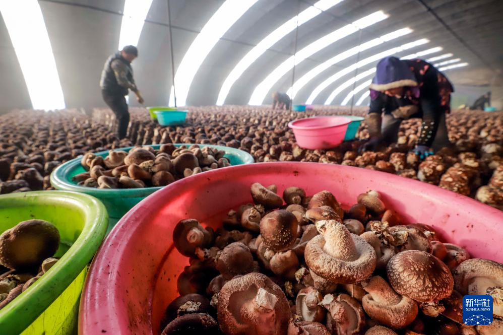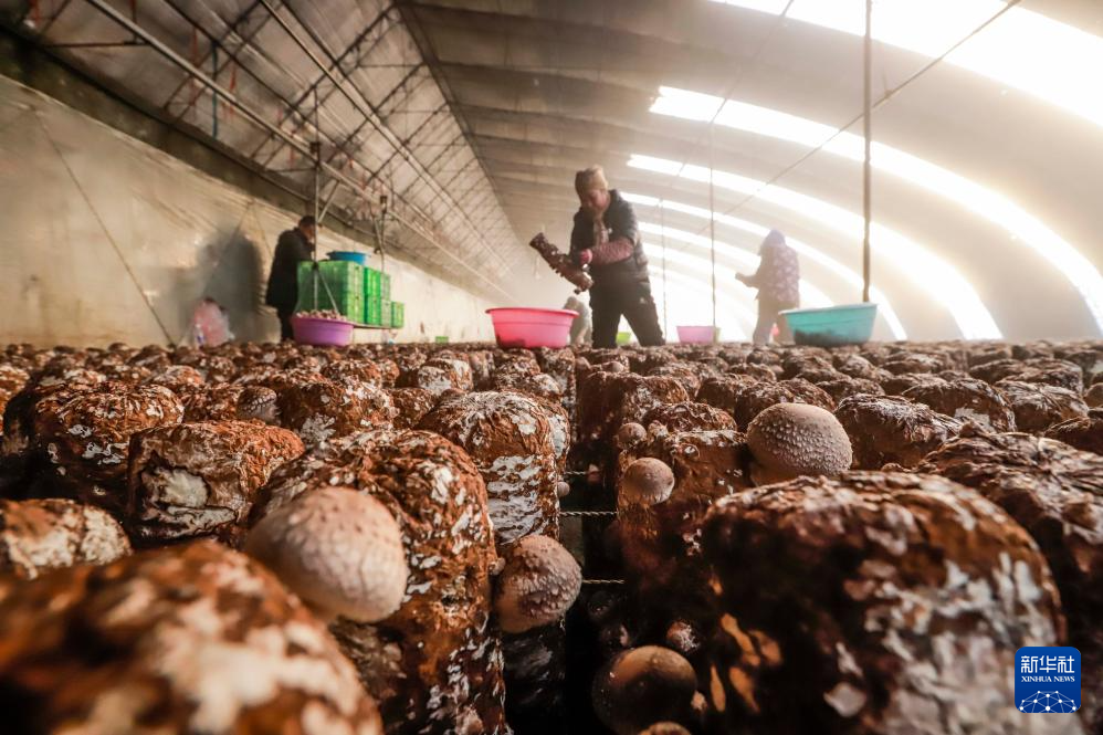12月24日,河北省遵化市东新庄镇王各庄村的农民在大棚收获香菇。