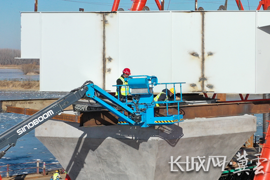 “目前,厂通路潮白河大桥的下部结构基础、墩台身、盖梁已全部施工完成,全面进入上部结构的钢箱梁吊装、小箱梁安装与桥面系施工阶段,总体进度已经完成了70%,我们计划2024年9月完工通车。”厂通路潮白河大桥河北段项目总工程师吴国梁说。