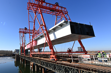 吴国梁介绍说,主桥的钢箱梁吊装采用两台额定起重重量240吨的栈桥龙门吊同步运行,将3跨共330米主梁分为6个大型节段,在河面上的作业平台进行组拼、吊装,单次单个节段吊装重达380吨,最大起重高度达12.5米,最长的高空带载行走约140米后吊装就位,最后再组合成桥,精准落位误差不超过5毫米,具有单次起重重量大、吊装高度高、满载运输距离长、水上施工风险高、龙门吊高宽比较大等特点。