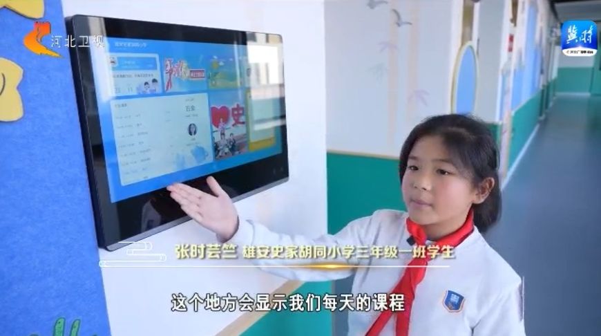 这是开学前同学们画的雄安史家胡同小学,现在我们觉得学校比我们想象的还要好。这个是我们每个班都要有的电子班牌,这个地方会显示我们每天的课程,然后这里是我们老师给我们拍的一些照片,这就是我们的课本,我们和北京的同学用的是同一套教材,不仅如此通过互联网直播,我们还会和他们上同一堂课。