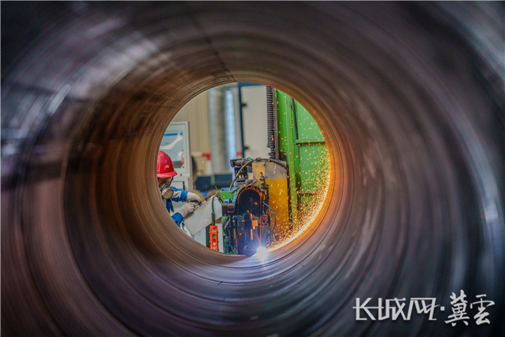 中油宝世顺(秦皇岛)钢管有限公司新能源管材厂员工正在为成型后的钢管焊接引熄弧板。长城网·冀云客户端记者 武佩剑 摄