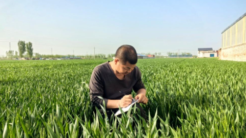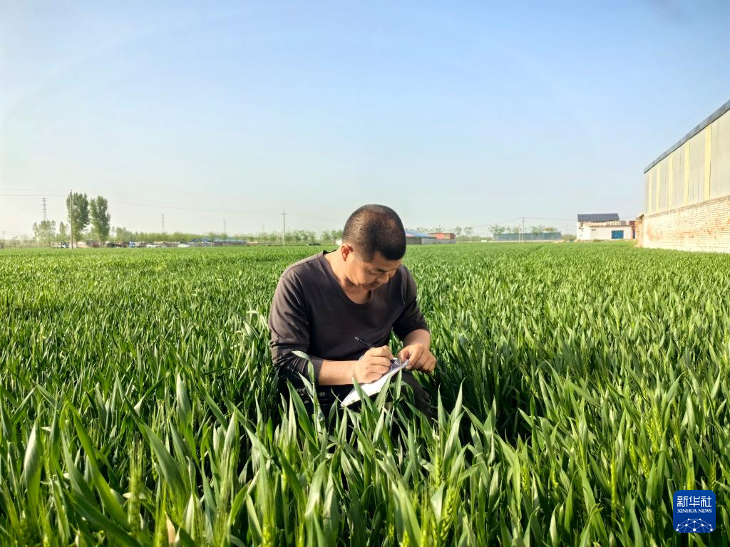 种粮大户黄树强在农田中记录小麦生长的各种信息。新华社记者 赵鸿宇 摄
