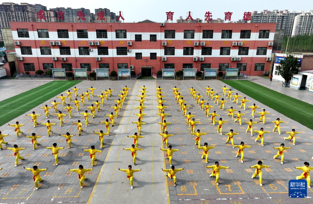 5月7日,学生在安平县第二实验小学做武术操(无人机照片)。
