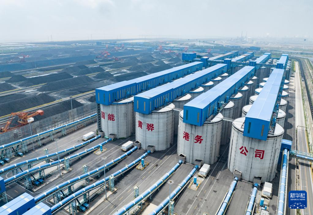 6月15日拍摄的黄骅港储煤堆场和筒仓(无人机照片)。