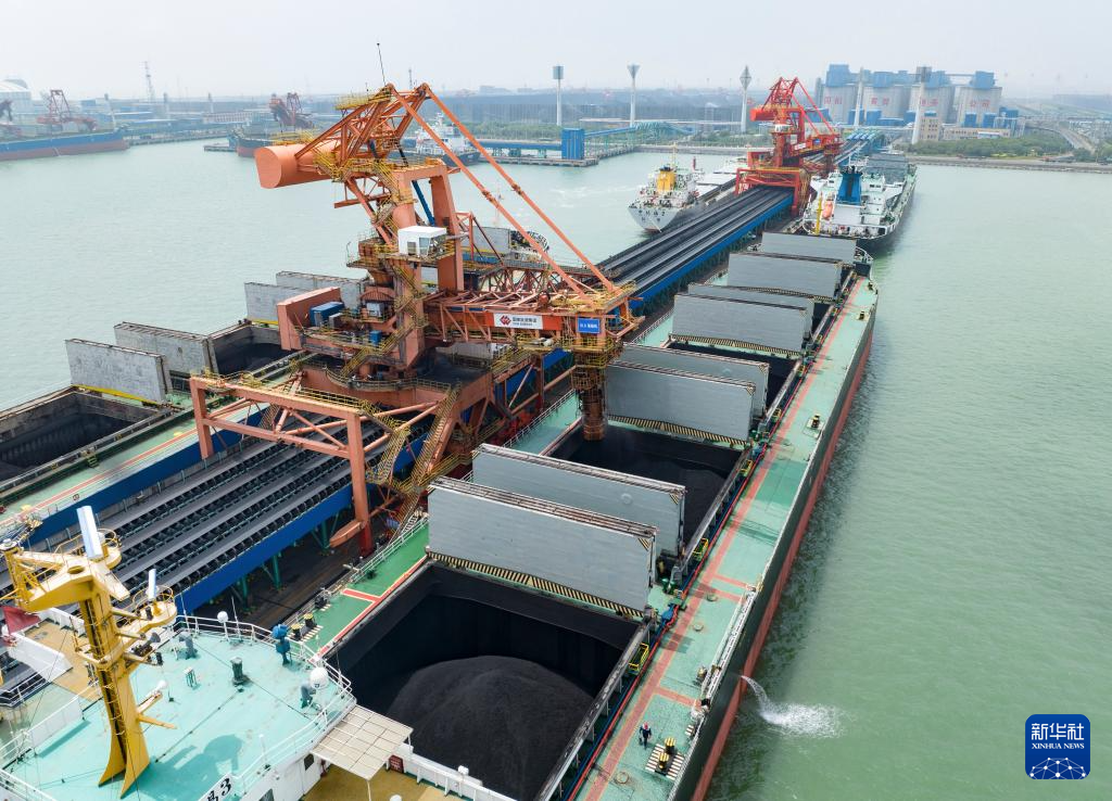 6月15日,国家能源集团黄骅港务公司三四期码头装船机将煤炭装入船舱(无人机照片)。