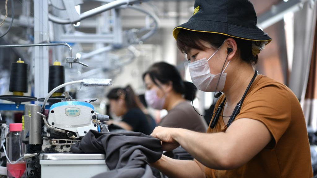 7月5日,河北省肃宁县一家服装生产企业的工人在赶制服装。