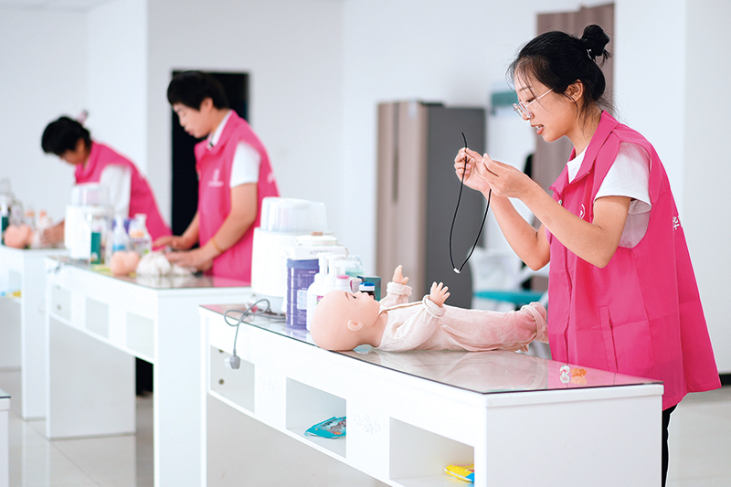 在河北省沧州市新华区巾帼家政服务技能大赛比赛现场,参赛人员展示育婴技能(2023年8月11日摄) 骆学峰摄/本刊