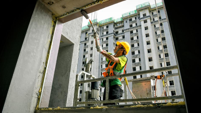 9月15日,中铁十二局工人在雄安新区大河片区建设现场刷防水涂料。